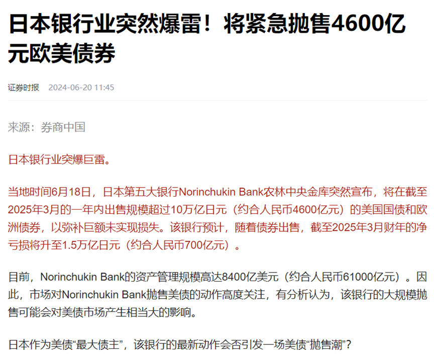 并且,这两天还有一条消息:日本第五大银行Norinchukin Bank农林中央金库突然宣布,将在截至2025年3月的一年内出售规模超过10万亿日元(约合625.8亿美元)的美国国债和欧洲债券!