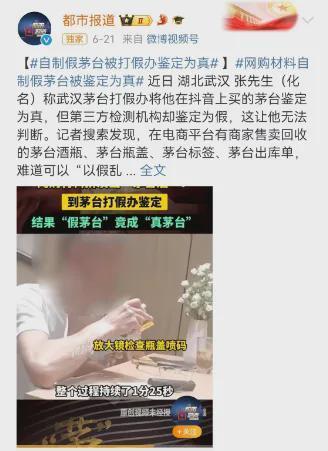 近日,有视频号“都市报道”曾对外爆料说,网购自制假茅台被武汉茅台打假办“鉴定为真”。