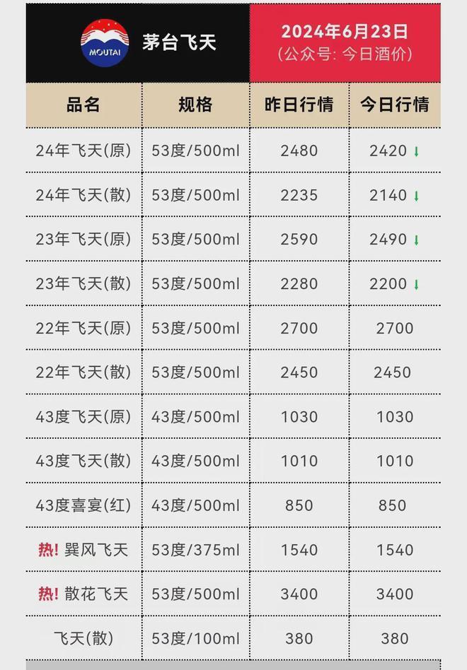 2024年飞天茅台原箱版53°/500ml规格的今日售价2420元,较昨日2480元跌去了60元,自昨日跌破2500元后继续下挫,较今年2月中旬(春节后)最高涨到3010元直接跌去了690元。