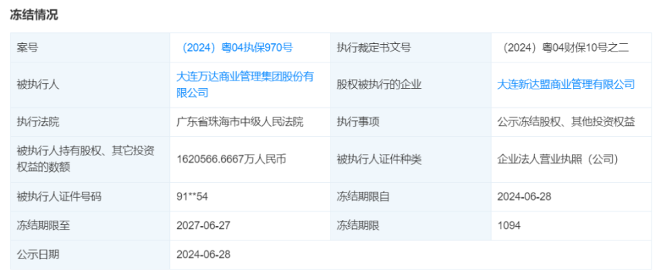 近日消息,大连万达商管(大连万达商业管理集团股份有限公司)所持有的大连新达盟(大连新达盟商业管理有限公司)全部股权再次被冻结。冻结期限至2027年6月27日。