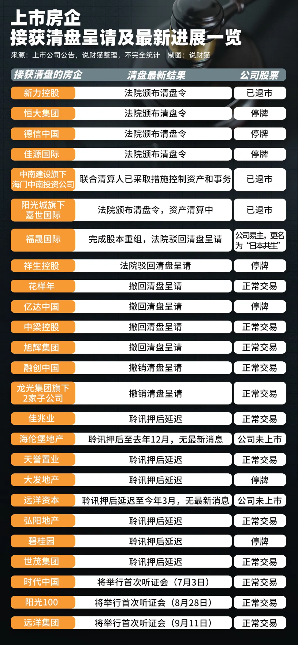 目前已经被勒令清盘的,有5家房企:恒大、新力、德信、佳源国际、阳光城旗下嘉世国际。