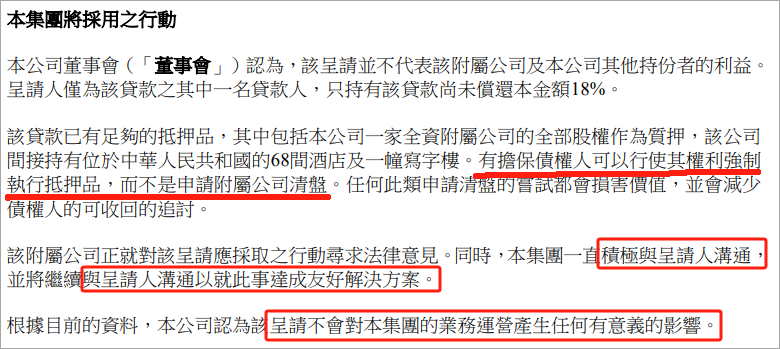 又或者是Seatown跳过强制执行,毕竟抵押品是中国的68间酒店及写字楼,变现也需要时间,债权人只想简单快捷拿回贷款本金及利息。
