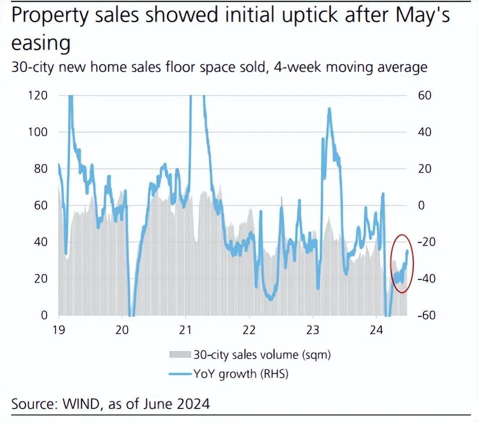 房地产政策正在朝着正确的方向发展,并可能有助于稳定未来3-6个月的销售。去库存迫在眉睫,因为80个城市的平均库存周转率已达到新高,而二三线城市的压力更大(截至5月,库存量高达32个月)。自宣布主要宽松措施以来,房地产销售有所改善,30个城市新房销售量同比下降从5月的-38%收窄至6月的-23%,部分原因是季节性因素。但如果房地产销售在未来几个月恢复疲软趋势,我们认为可能会进一步出台房地产宽松措施,例如增加政策资金,以及更多放宽甚至取消一线城市的购房限制。