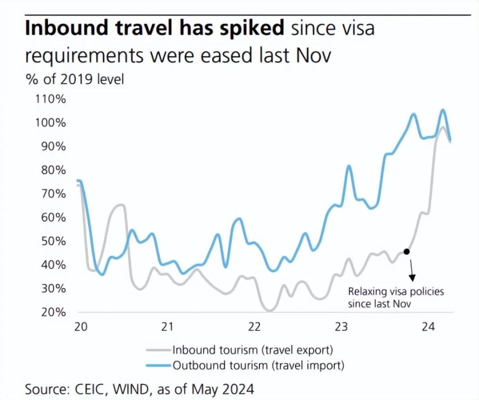 各种放松措施引起了海外游客,尤其是欧洲游客对访问中国的兴趣激增。在线旅行社Trip.com去年年底的数据显示,2023年从欧洲飞往中国的整体航班预订量同比增长了663%(与2019年相比增长了近29%)。英国和德国是全球入境中国游客的十大来源国之一;上海仍然是欧洲人最喜欢的目的地,它融合了现代和传统,其次是北京、广州和深圳。因此,自2024年3月以来,入境旅游(以旅游出口衡量)已从2023年11月的46%飙升至2019年水平的90%以上。随着免签计划即将扩大,流入量可能会进一步增长。