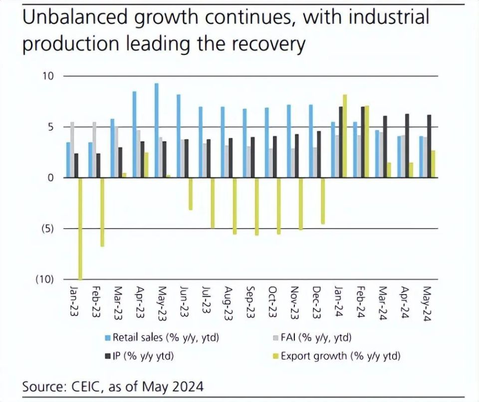 因此,虽然2024年前五个月的零售额同比增长4.1%,但服务消费(尤其是餐饮和休闲用品消费)的繁荣是主要亮点和推动力。值得注意的是,1-5月餐饮销售额同比增长8.4%,远超整体商品销售额同比增长3.6%,表明酒店业强劲复苏。