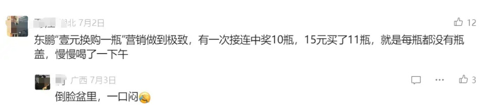 东鹏特饮的开盖有奖主打一个高中奖率,雨露均沾,有网友表示,在“壹元乐享”活动中,接连中奖10瓶,花了15元买了11瓶。正在进行的瓶盖扫码赢红包活动,更是打出了“100%中微信红包”的口号。
