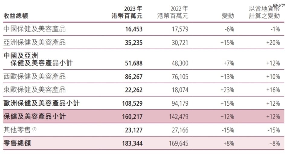 今年3月,屈臣氏母公司长江和记发布了2023年年报,当中提到,目前屈臣氏在全球28个国家经营16500间门店,并拥有12个零售品牌;去年收入1833.4亿元,按年度增长为8%,全球收益渐渐回暖。
