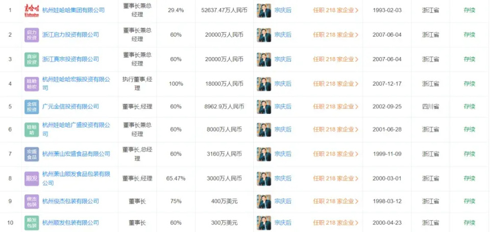 天眼查App显示,宗馥莉名下关联企业有170余家,其中160余家为存续状态,包括杭州娃哈哈启力食品集团有限公司、广州恒枫饮料有限公司、杭州娃哈哈电子商务有限公司等,均为娃哈哈集团旗下或上下游公司,涉及饮料、食品、电商、物流、包装、营销、广告、投资等各领域,宗馥莉多担任董事长、董事、经理等职务。