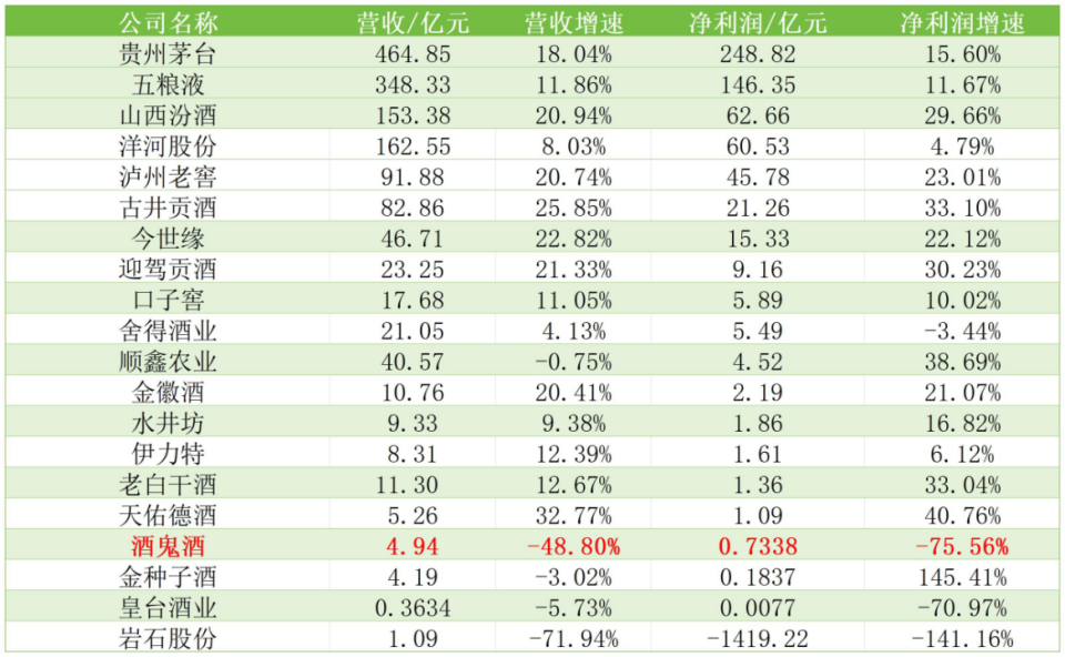 今年一季度,酒鬼酒的业绩继续垫底。财报显示,2024年一季度酒鬼酒营收为4.94亿元,同比下滑48.8%;净利润为7338.03万元,同比下降75.56%,仅为去年同期的四分之一,营收和净利润的增速在A股20家上市酒企中依然垫底。