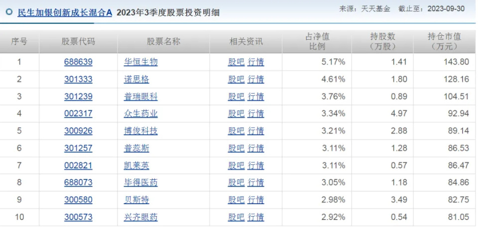 我们来看看她旗下基金的持仓。以民生加银创新成长混合A为例,2024年2季度前十大持仓是这样的: