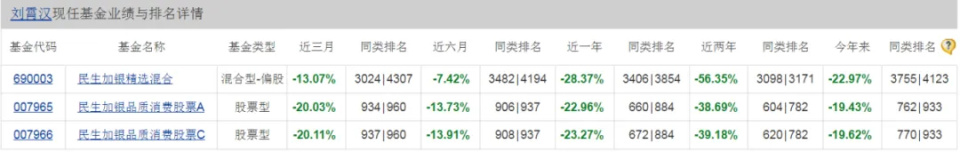 例如刘霄汉,累计任职时间10年又245天,也算是行业老将,但其现任基金业绩与排名一栏,同样是一片绿。其中,民生加银精选混合近两年亏了56.35%。