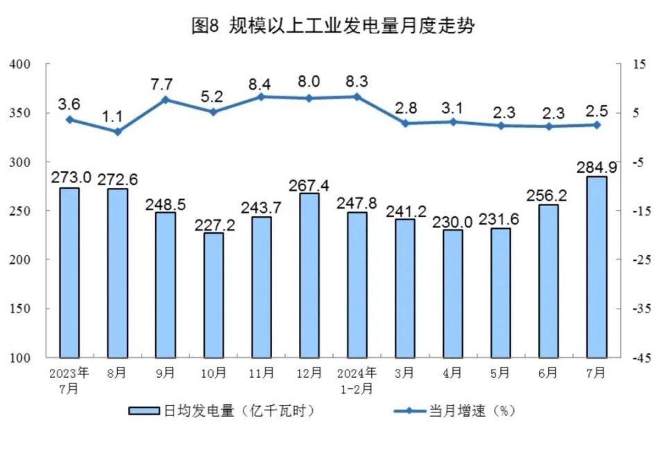 根据统计局的数据,7月份规模以上工业发电量8831亿千瓦时,同比增长2.5%,1~7月份规模以上工业发电量53239亿千瓦时,同比增长4.8%。