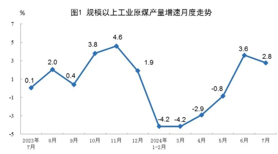 7月份规模以上原煤产量3.9亿吨,同比增长2.8%,1~7月份规模以上原煤产量26.6亿吨,同比下降0.8%。