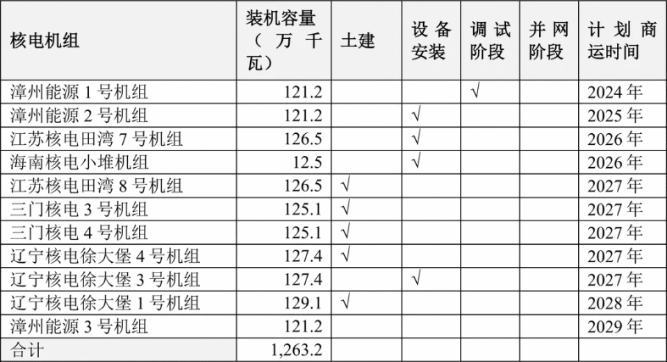 上图就是中国核电未来5年的新增装机计划,到2029年新增装机将达到1263.2万千瓦。