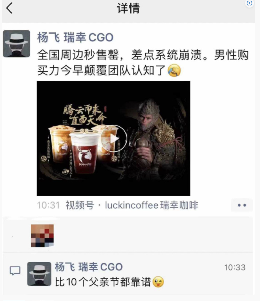 瑞幸CGO杨飞在朋友圈表示,(黑神话悟空)全国周边秒售罄,差点系统崩溃。男性购买力今早颠覆团队认知了。