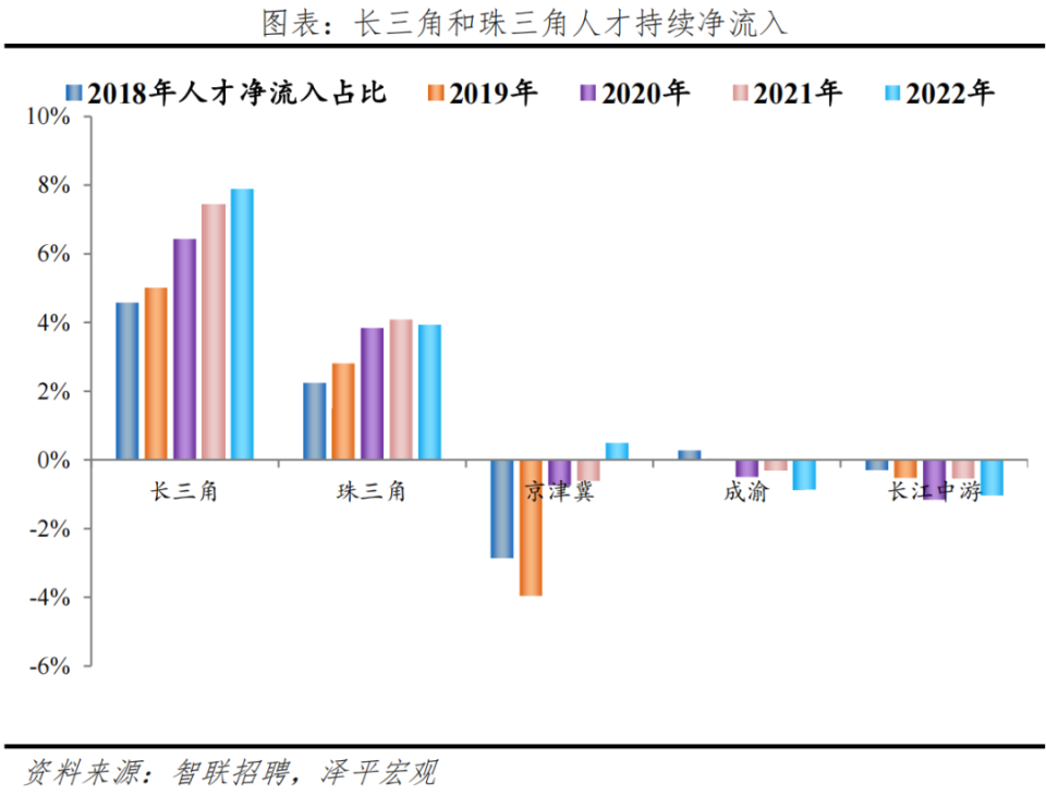 从国际经验看,人口迁移分为两个阶段:从乡村到城市迁移,到在城市化中后期明显向都市圈城市群迁移。从国际看,美国人口迁移呈现两个特点:一是在地区层面,从向传统工业主导的铁锈8州集聚,到向能源、现代制造和现代服务业主导的西海岸、南海岸集聚。二是在城乡层面,人口在城市化中后期明显向大都会区集聚。日本人口随产业持续向大都市圈集聚,但在1973年左右从向东京圈、大阪圈、名古屋圈“三极”集聚转为向东京圈“一极”集聚。(请参考“泽平宏观”深度报告《中国人口大迁移的新趋势》《中国房地产市场的六大失衡与对策》《中国城市人才吸引力排名2023》)