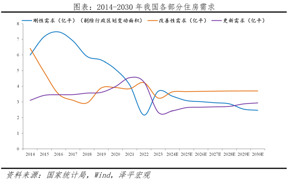 我们连续6年在《中国住房存量报告》系列中跟踪研究发现,综合考虑城镇化进程、改善性需求、城市更新等,未来中国住房需求整体呈缓慢下降趋势,但中长期仍有发展空间。根据我们测算,2024-2030年年均新增城镇居住需求约9.3亿平,相较2011-2023年年均新增城镇居住需求的11.3亿平有一定下降,2030年我国居住总需求或将缓慢降至9.1亿平。2024年我国年新增城镇居住需求约9.4亿平,城镇常住人口增加(剔除行政区划变动,后同)、居住条件改善、城市更新需求分别占总需求的36.2%、38.3%、25.5%。未来六年,改善性需求将成为我国住房市场最大的需求支撑。