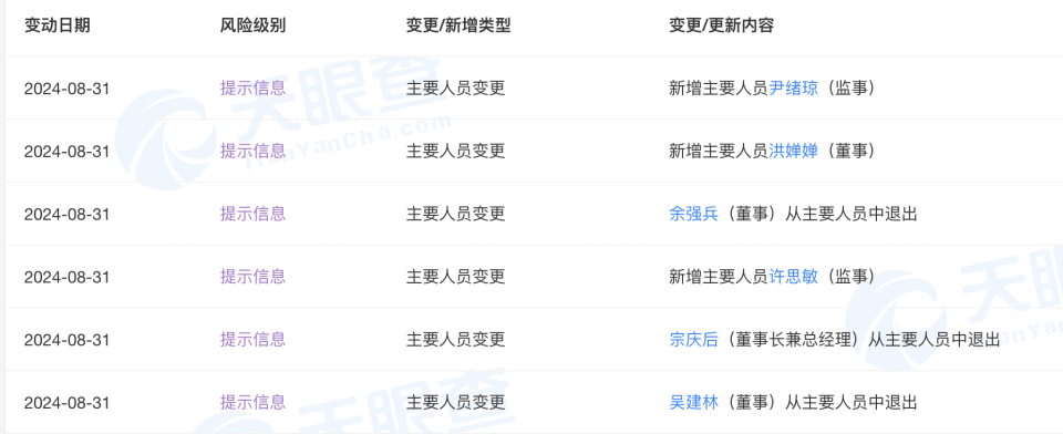 8月31日,据天眼查显示,杭州娃哈哈集团有限公司发生工商变更,宗庆后卸任法定代表人、董事长兼总经理职务,均由宗馥莉接任。同时,董事张晖、监事郭虹等多名高管退出,新增叶雅琼、费军伟等为董事,王国祥为董事兼副总经理。