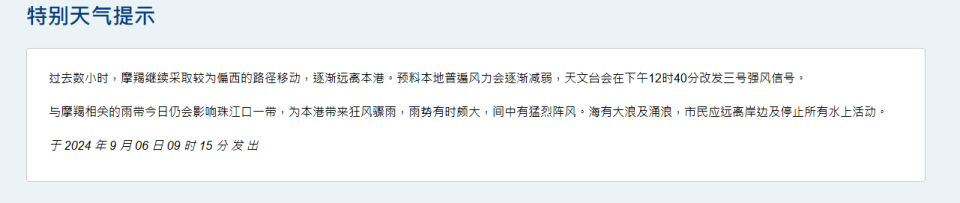 消息方面,香港天文台发布提示称,将在下午12时40分改发三号强风信号。按香港交易所目前的交易规则,若八号或以上台风信号、黑色暴雨警告或极端情况警告于中午12时仍然生效,证券及衍生产品市场将会全日暂停交易。