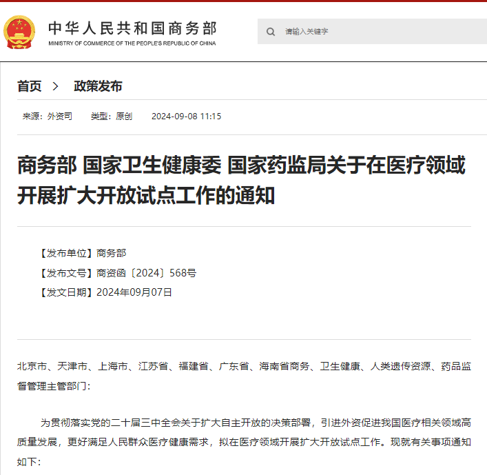 商务部网站9月8日消息,近日,商务部、国家卫生健康委、国家药监局联合印发关于在医疗领域开展扩大开放试点工作的通知(以下简称通知)。