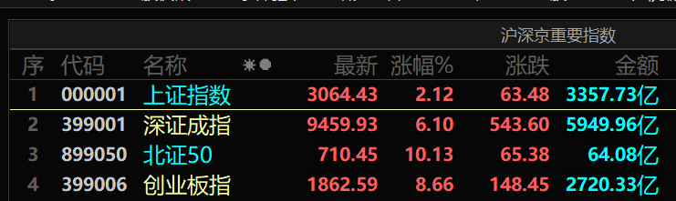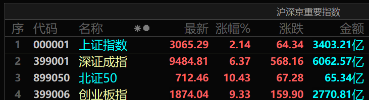 上证指数收涨2.89%逼近3100点,深证成指收涨6.71%;创业板指收涨10%,创历史最大单日涨幅,成交额亦刷新历史纪录;北证50收涨11.14%。