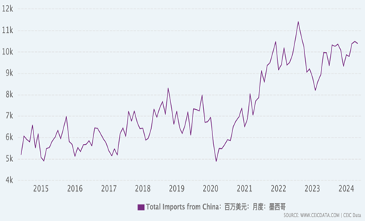 如果我们进一步拆分来看,从2018年到2023年,中国对墨西哥的月度出口额从下图平均60~70亿美金,增长到100亿美金左右,整体增长了400亿美金左右的年度出口总额。之所以会出现这样的情况,是因为2018年11月30日特朗普推动下正式签署《美墨加贸易协定》(USMCA),符合一定条件的产品,可以无关税从墨西哥进入美国和加拿大市场,《美墨加贸易协定》的签订,极大地推进了墨西哥作为一个中国对美输出商品转口贸易的中心节点的地位。也成为地缘政治博弈下的制造业端长期最大的收益者。
