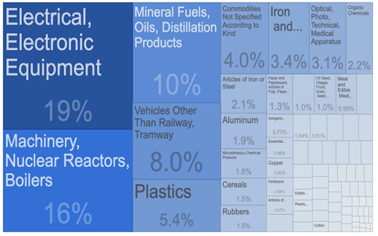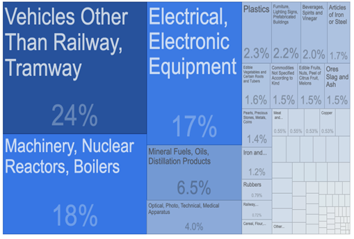 墨西哥的经济以出口为导向。墨西哥的主要出口产品是制成品(占总出口的 89%)和石油及石油产品(7%)。在制成品中,金属、机械和设备是主要类别(59%),汽车约占总销售额的 29%。墨西哥的主要出口伙伴是美国(72%),对美国的出口主要集中在汽车行业(83%);