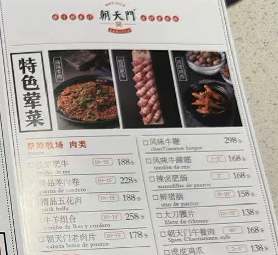 朝天门火锅(墨西哥城Palanco区):人均价格400~500人民币(下图为墨西哥比索,100墨西哥比索约等于40人民币),我是在工作日晚餐跟朋友去的,人满为患,华人顾客约占一半多一点,下面菜单价格,九宫格锅底人民币280元;一份普通150g左右的肉菜基本人民币都是80~100元,这个价格放在大上海都算是比较炸裂的价格了;我查了一下这个品牌在重庆的门店,人均价格100+。