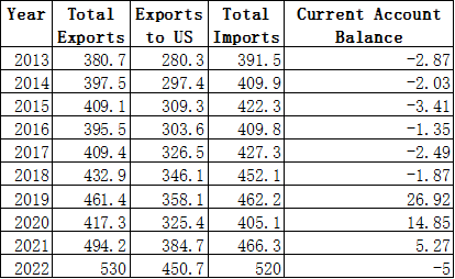 截至 2023 年底,墨西哥国际商品贸易总值在此期间达到 1.2 万亿美元。总出口额5930 亿美元,总进口额5985 亿美元。按当前数据计算,墨西哥的贸易逆差为 55亿美元。从下图我们可以看出,与中国的出口量大,但是产生了大量贸易盈余的情况不同,墨西哥的情况与越南更加接近,过去十年,出口额大幅增长(尤其是对美国的出口额大幅上升),但是另外一方面,经常项目盈余在盈亏平衡线附近徘徊,证明墨西哥需要大量进口商品,来支撑快速上升的出口增长(或者是国内居民消费水平的快速上升带来了更多的需求)。