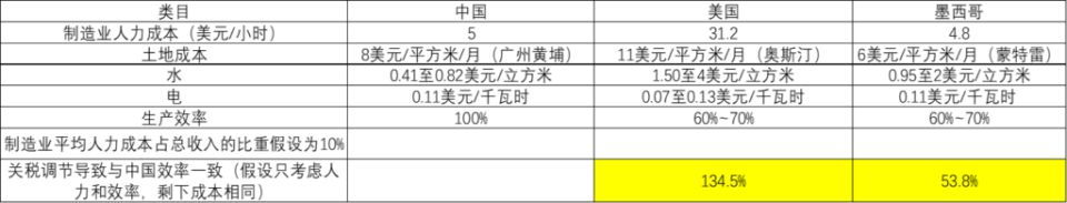 在上表中,用每天工作8小时,每周工作5天折算制造业的人力成本,因为生产效率的不同,人力成本的不同,假设三个市场的其它成本都完全相同(事实如图所示并不相同但是相差不大)的情况下,我们计算通过关税条件让中美墨生产竞争优势拉平的最低关税要求,墨西哥为50%出头,美国为130%出头。