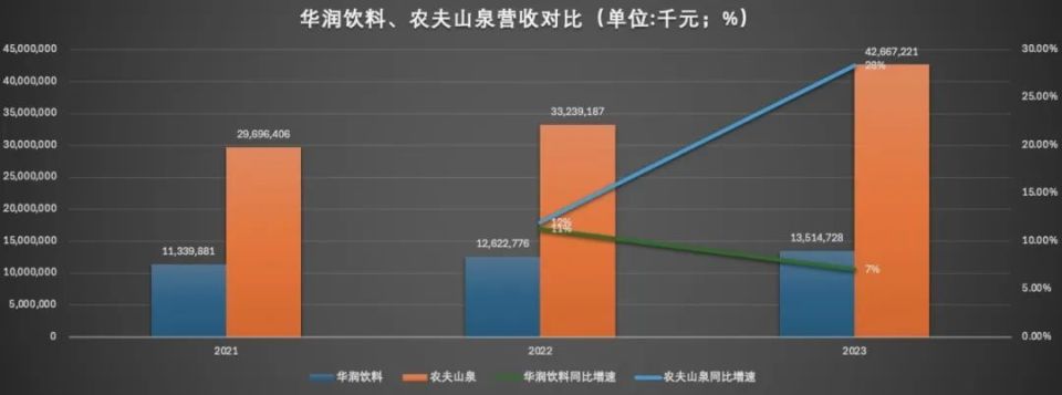 对比不难发现,无论是收入规模还是营收增速,华润饮料都均被农夫山泉甩在身后,2023年农夫山泉的收入规模是华润饮料的3倍之多,农夫山泉营收增速稳步增长,华润饮料则出现增速放缓的迹象。