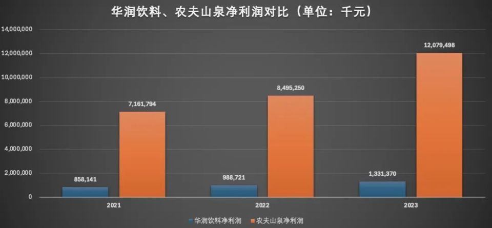 净利润方面,2023年,农夫山泉净利润是华润饮料的9倍之多。
