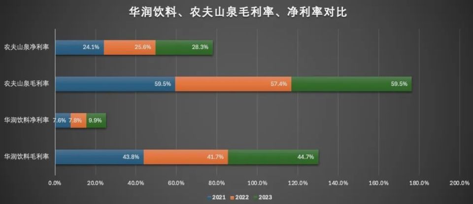 2021年至2023年,华润饮料的净利率分别为7.6%、7.8%和9.9%;农夫山泉的净利率分别为24.1%、25.6%和28.3%。