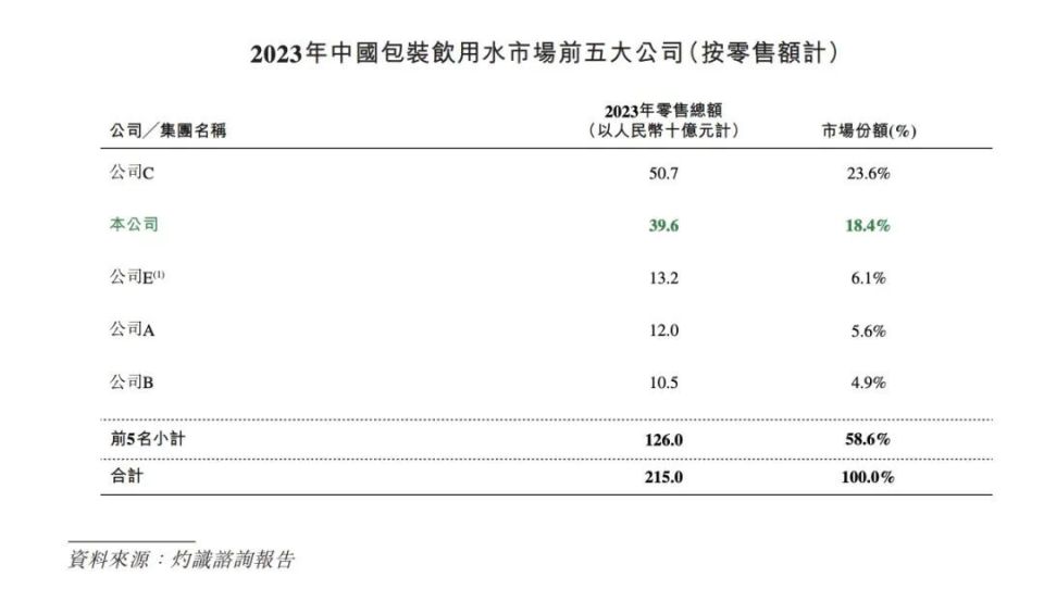 从市占率看,农夫山泉排名第一,华润饮料位列第二。据灼识咨询报告显示,在整个包装饮用水市场,2023年农夫山泉以23.6%的市场份额位列第一,华润饮料则以18.4%的市占率位列第二。