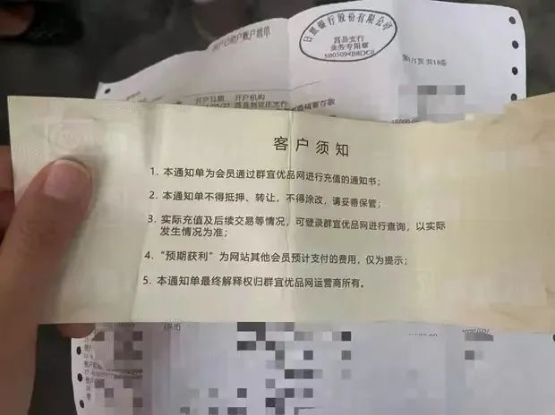 ●通知单的背面,显示其为群宜优品网充值款的通知书。图/徐巧丽