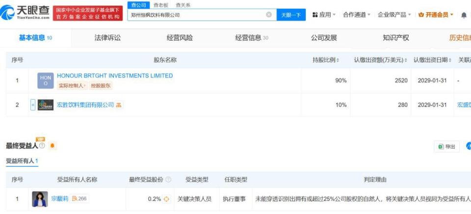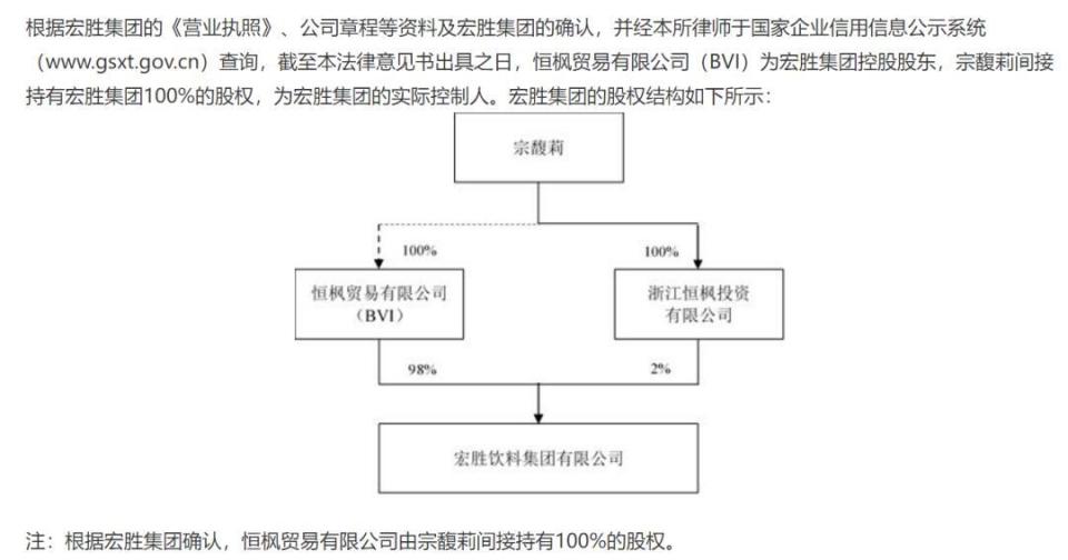 2007年,财经杂志报道,根据广州工商局的登记资料,一份有宗庆后、宗馥莉亲笔签名和盖有娃哈哈集团公章的文件中,宗庆后和宗馥莉分别娃哈哈集团和杭州宏胜饮料有限公司(现在的宏胜集团),证明“广州娃哈哈恒枫饮料有限公司”的“中方股东杭州宏胜饮料有限公司”是“杭州娃哈哈集团有限公司的子公司”。