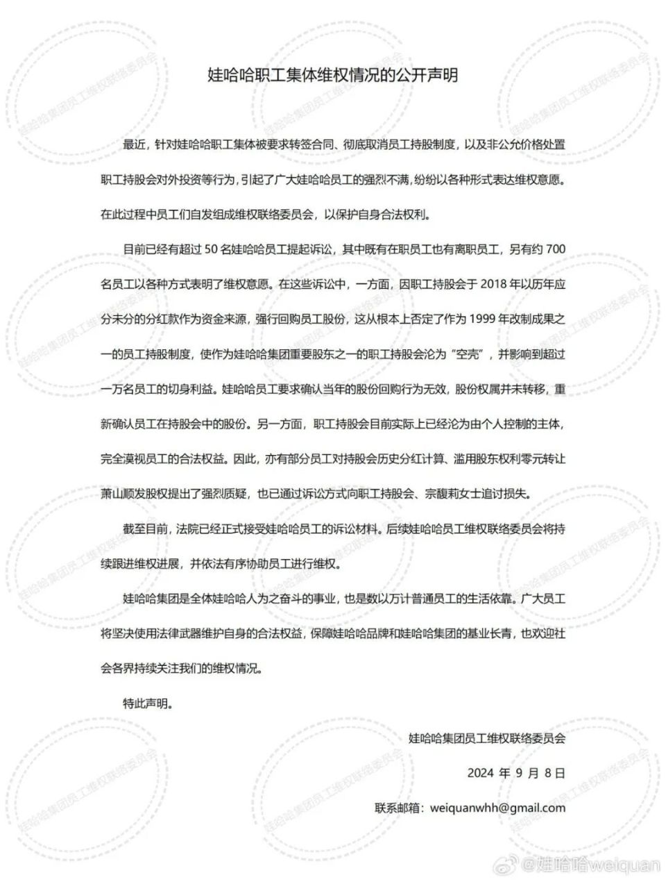 而9月8日,《娃哈哈职工集体维权情况的公开声明》(以下简称为“声明”)在微博上流传开来,内容包括法院已经正式接受娃哈哈员工的诉讼材料,这则声明落款为“娃哈哈员工维权联络委员会”。