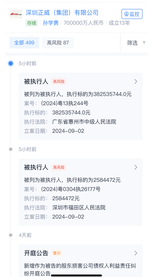 今年9月份,天眼查法律诉讼信息显示,深圳正威(集团)有限公司9月2日新增2条被执行人信息,执行标的合计3.85亿余元,被执行人还包括惠州博威新材料有限公司、惠州驰威新材料有限公司、王文银等,执行法院为广东省惠州市中级人民法院、深圳市福田区人民法院。