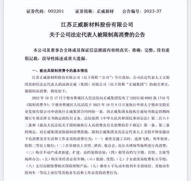 2023年10月18日,正威新材公告,公司法定代表人王文银因其担任法定代表人的深圳正威(集团)有限公司的相关事宜,被限制高消费。