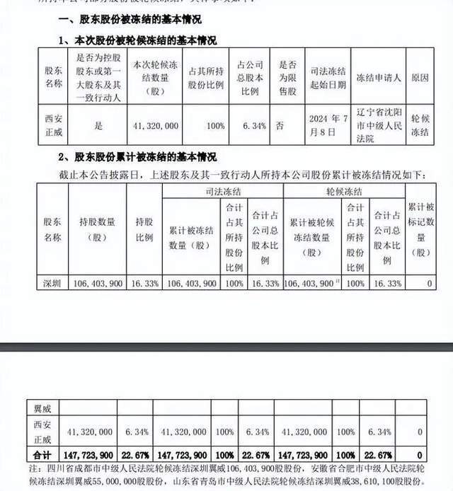 两天后,也就是今年的7月19日,深圳正威集团所持的1亿多股权被冻结了。这次是因为金融借款合同纠纷,被辽宁省营口市中级人民法院执行的。