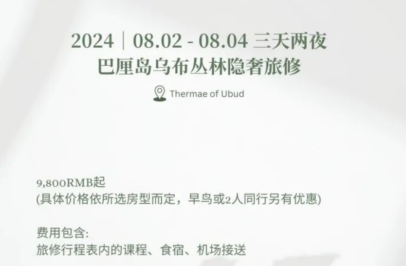 相关的产品在这几年层出不穷,包括疗愈酒店、疗愈度假村、康养旅游、森林康养、森林冥疗愈体验、疗愈主题旅游等等。不差钱的用户,还可以去境外旅修,体验当地特色课程。