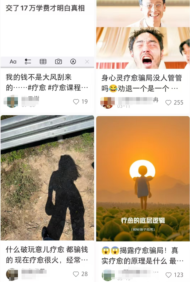 除了这些,在小红书等社媒平台,不少人都站出来揭露疗愈“骗局”。