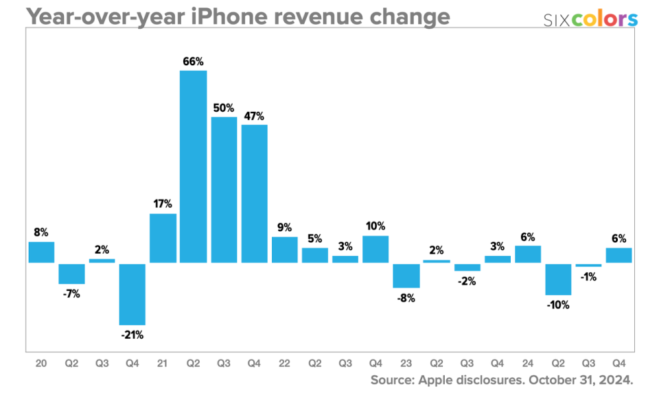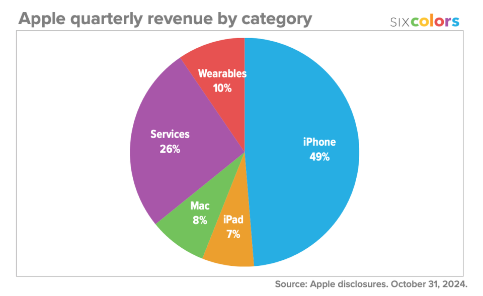 尽管如此,iPhone 系列产品仍是苹果获得营收的「顶梁柱」。在第四财季,iPhone 的销售收入占总营收额的 49%,几近一半。同时,iPhone 的营收在连续两季同比下降之后终于迎来了增长,对于苹果来说也是个好消息。
