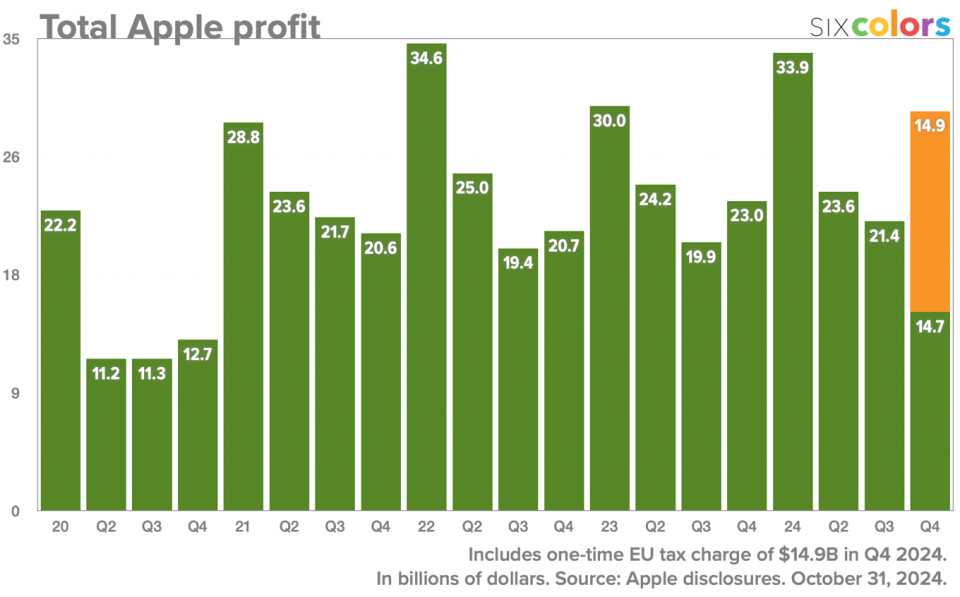 在一串令人眼花缭乱的数字中间,有一个数据相当醒目:苹果 Q4 的总利润同比下降 36%。究其原因,主要是苹果向爱尔兰政府补缴了时间跨度从 2003 年到 2014 年,约合 158 亿美元的税款。