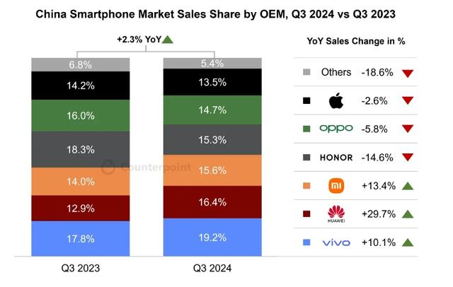 据市场研究和咨询机构 Counterpoint 的数据,iPhone 在第三季度(即第四财季)再次跌出中国智能手机市场前五名。这是自苹果第二季度首次跌出前五以来的又一次,iPhone 16 系列的发布也没能补救。