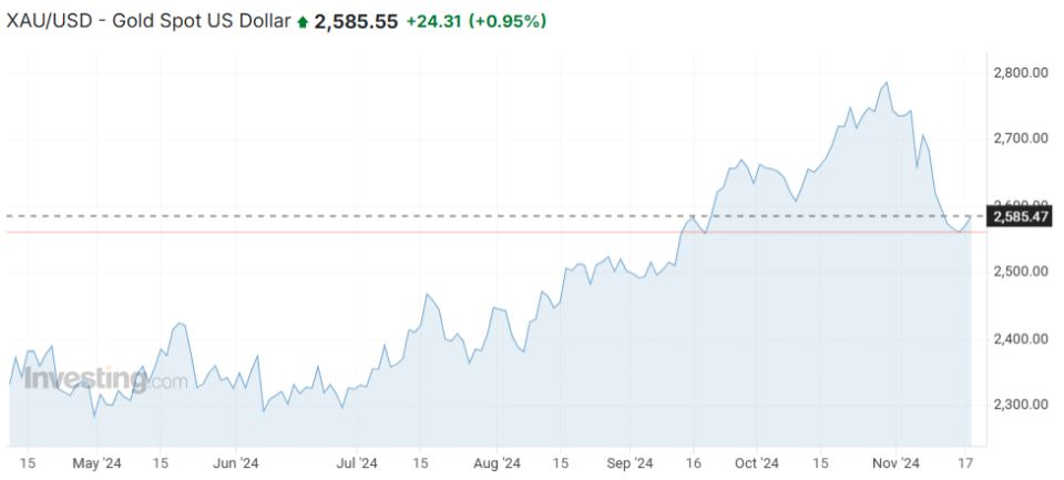 截至目前,现货金报每盎司2,585美元左右,上月曾冲至2,790美元上方。