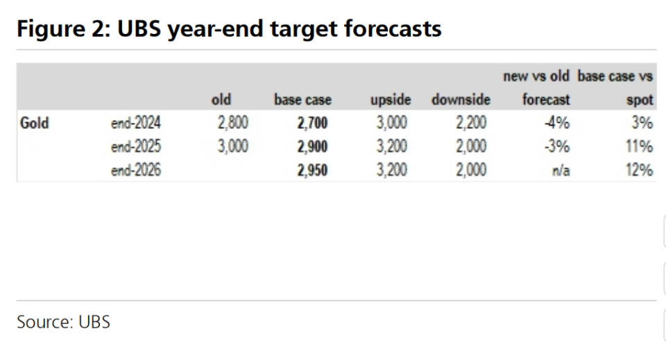 在短期内,瑞银预计黄金价格将以震荡整合为主,年底可能以上涨收官,目标价定在每盎司2700美元左右。2025年低价格将刷新历史新高,年终目标价为每盎司2900美元。