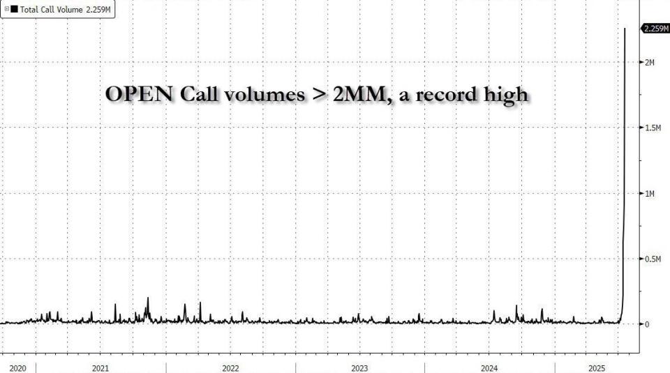 而真正的疯狂场面,甚至还不在股票本身,而是在期权市场上。随着看涨期权爆炸式上涨,发生了堪称历史性的伽马挤压 (gamma squeeze)。如下图所示,Opendoor的看涨期权交易量周一超过了200万份,远超该公司历史上的任何一天,并且创下了今年以来美国个股中第三高的看涨期权日交易总量。