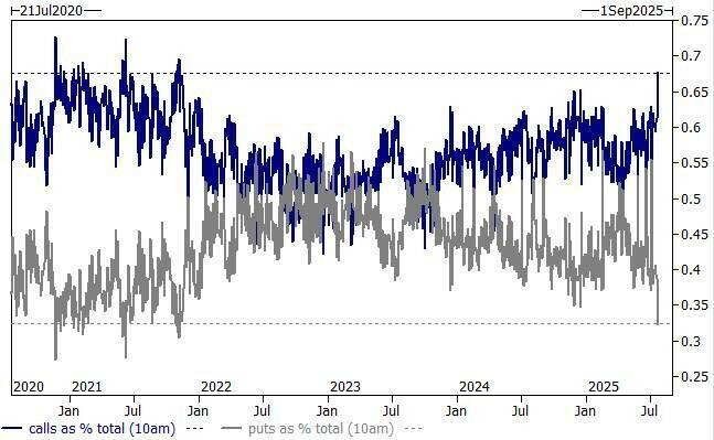 而高盛衍生品策略师则表示,其目前正开始感受到“2021年的氛围”,因为市场显得非常“追涨”: “看涨期权交易量占总市场交易量的近70%(周一美东时间上午10点观察数据)……自2021年Meme热潮以来,这一比例从未如此之高。”