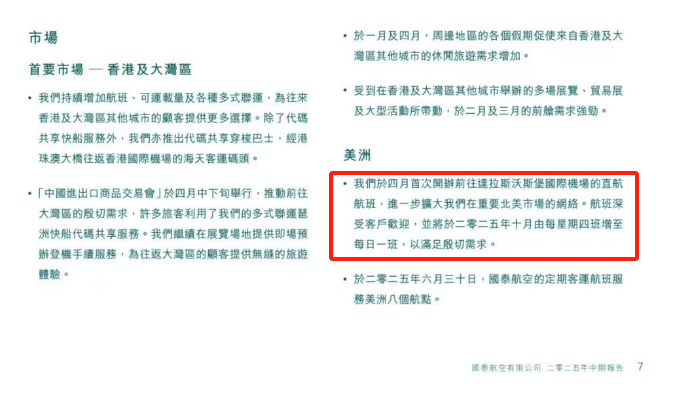 目前,国泰航空已常态化运营的中美航线,覆盖美国东西海岸及南部核心枢纽,包括香港往返洛杉矶、纽约肯尼迪、旧金山、波士顿、芝加哥、达拉斯这6条航线。